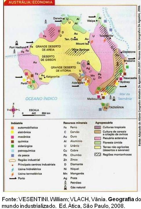 Por outro lado, a Austrália é o único país do mundo a ocupar, sozinho, a maior parte das terras do continente em que se localiza. Convém observar que o subsolo desse imenso país é rico em reservas minerais, entre as quais se destacam ouro, carvão mineral, cobre, níquel, bauxita, manganês, urânio, petróleo e gás natural. Pelos motivos que explicaremos adiante, a maior parte da população australiana concentra-se no litoral da região sudeste, banhado pelo oceano Pacífico.